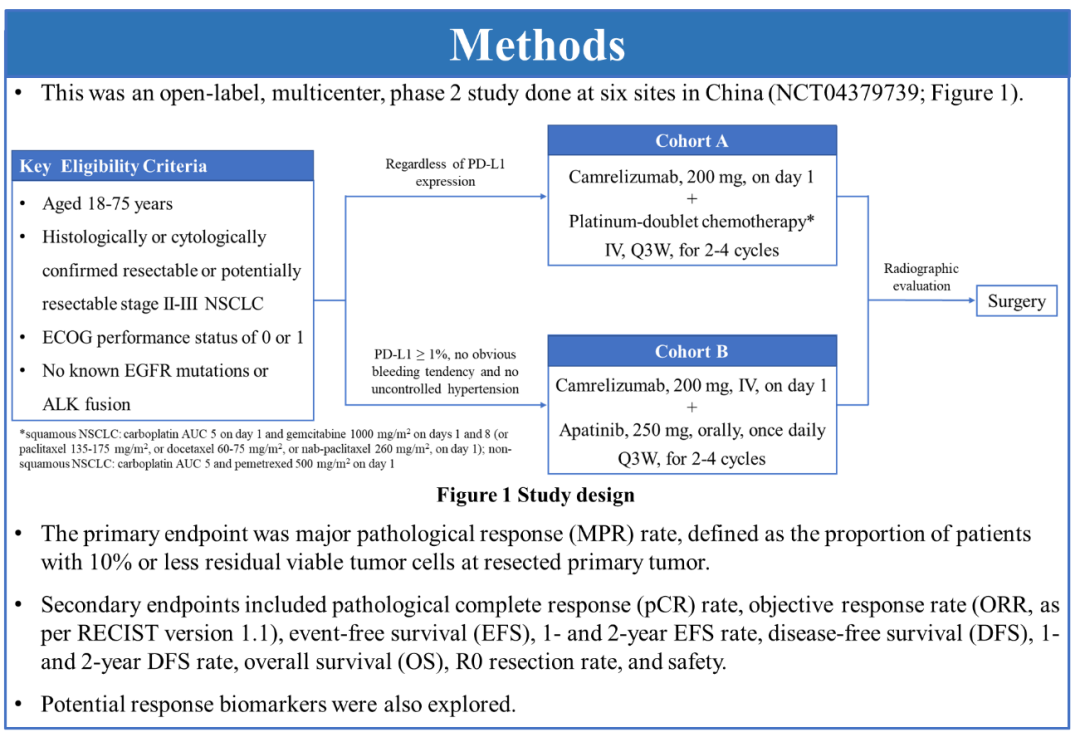 这是一项开放、全国多中心的II期临床试验(NCT04379739),旨在评估卡瑞利珠单抗联合化疗或阿帕替尼新辅助治疗Ⅱ-Ⅲ期可手术切除或潜在可手术切除NSCLC患者的疗效和安全性。截止2022年6月,共纳入89例患者。其中58例接受卡瑞利珠单抗(200mg,q3w)联合化疗,包括28例(48.3%)可切除患者和30例(51.7%)潜在可切除患者。另外31例患者接受卡瑞利珠单抗联合阿帕替尼治疗(250mg,qd),其中10例(32.3%)可切除患者,21例(67.7%)潜在可切除患者。该研究的主要终点为主要病理缓解(MPR)率,次要终点包括病理完全缓解(pCR)率、客观缓解率(ORR)、无事件生存期(EFS)、1-和2-年EFS率、无疾病生存期(DFS)、1-和2-年DFS率。